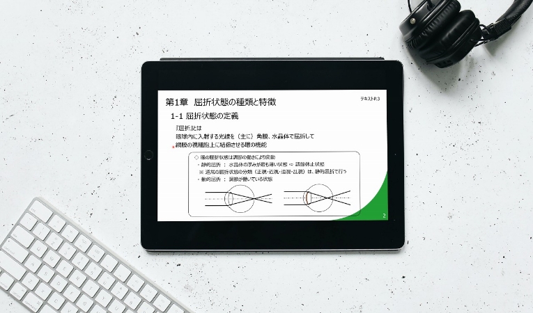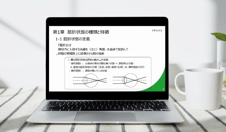 『視力屈折測定』『光学』『商品知識』をメインテーマとし、眼鏡店で働く上で必要な基礎知識を全24講義に集約。ご自身のペースに合わせた学習スケジュールで、着実に力を付けることができる1年間コースです。