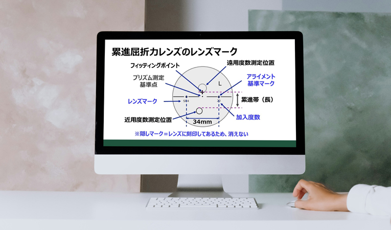 累進屈折力レンズの構造や種類を学びます。基本構造では、累進帯の長さや特徴、収差分布から、累進設計(外面累進、内面累進、両面による設計)などを学びます。 また、中近両用レンズ、近近両用レンズの構造と見え方の解説も行っています。